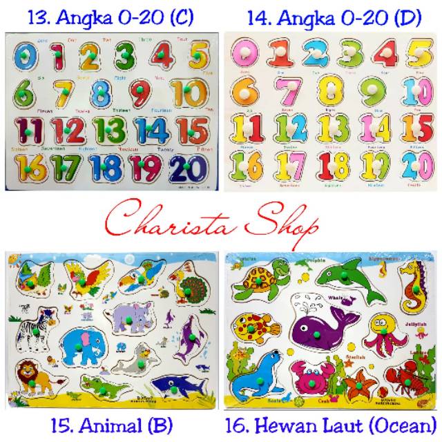 Puzzle Kayu Puzzle Knob Kayu Angka Abjad Transportasi Buah Hewan Shapes Huruf Hijaiyah